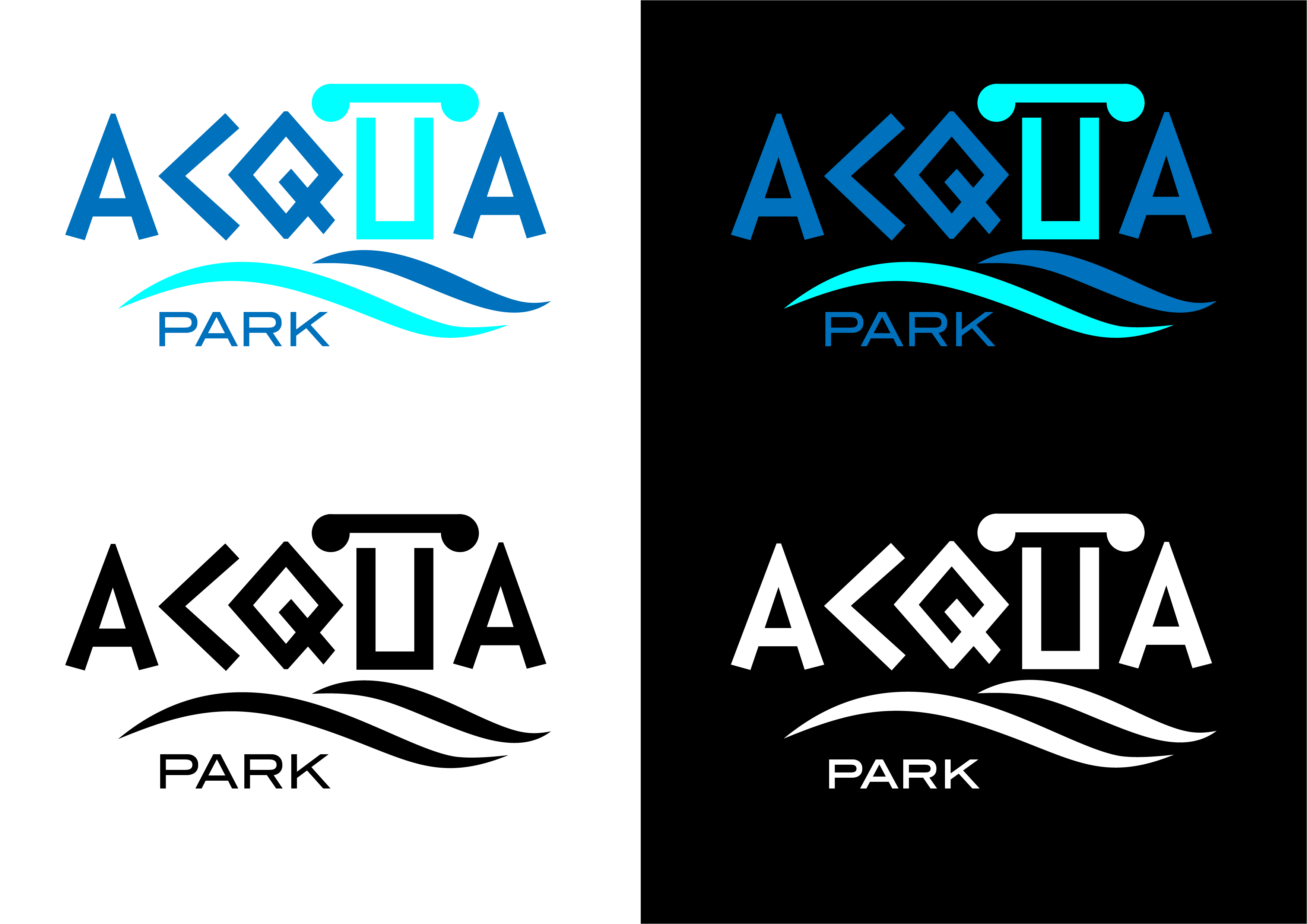Logo ACQUA PARK, pour un parc aquatique à Rome. La référence visuelle de la marque est la typographie de l’ancienne écriture romaine et l’utilisation de deux nuances de bleu, qui est également une référence au paysage bleu de l’eau et du ciel.