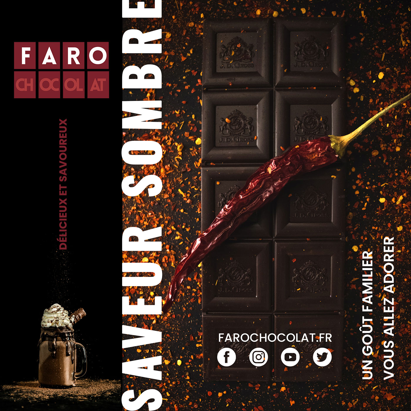 Création de l’identité visuelle de FARO CHOCOLAT, marque de distribution de chocolats aux saveurs atypiques.